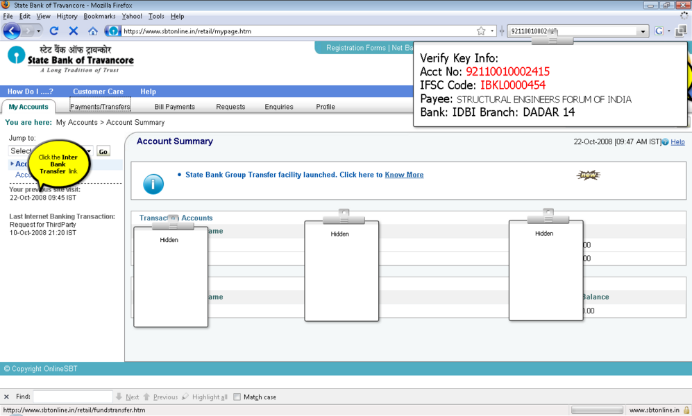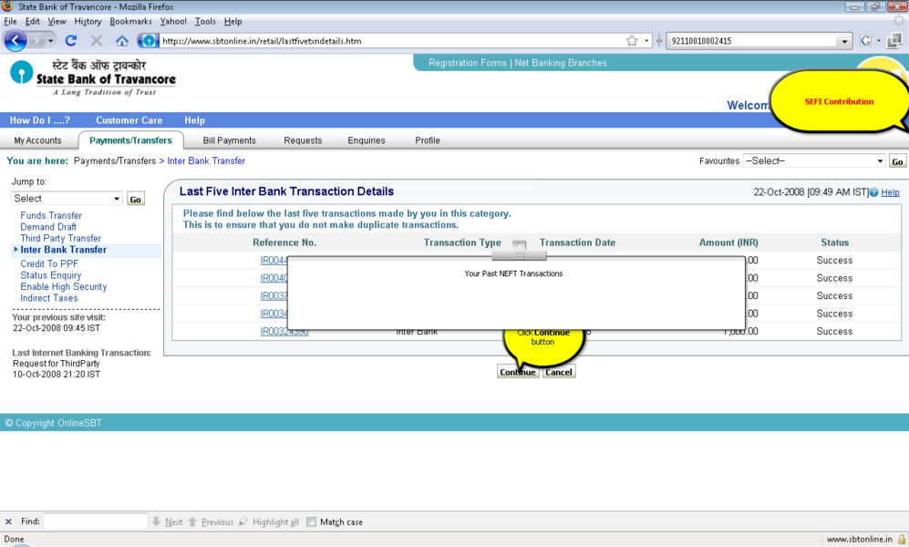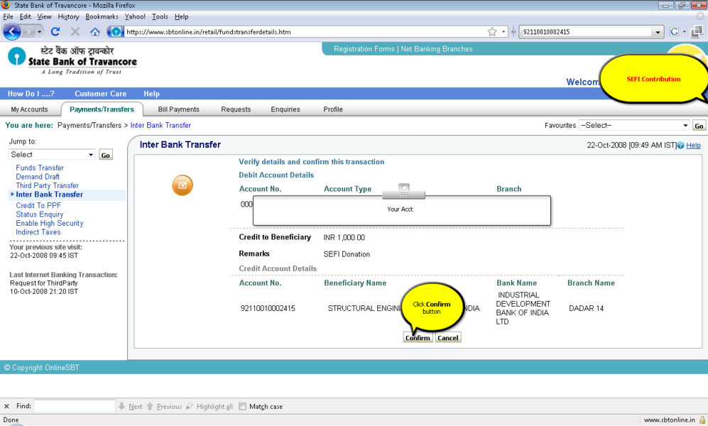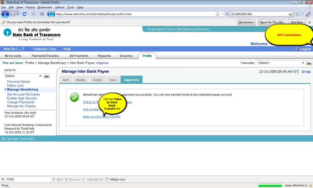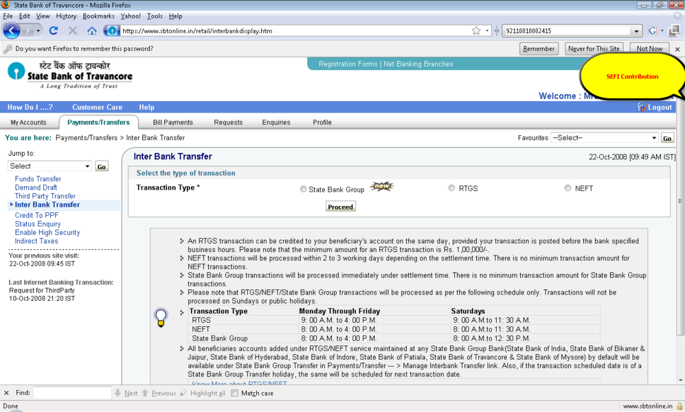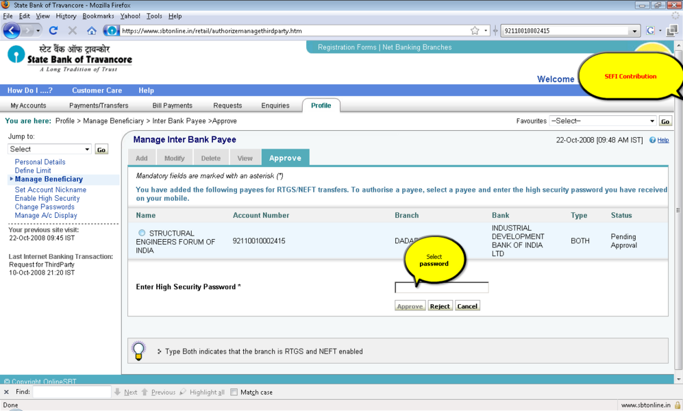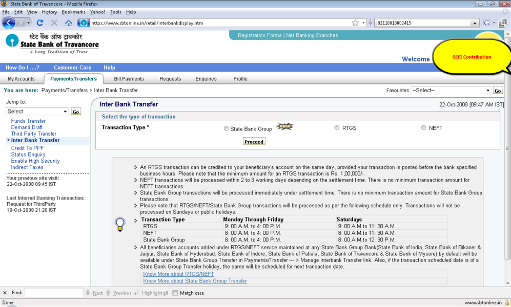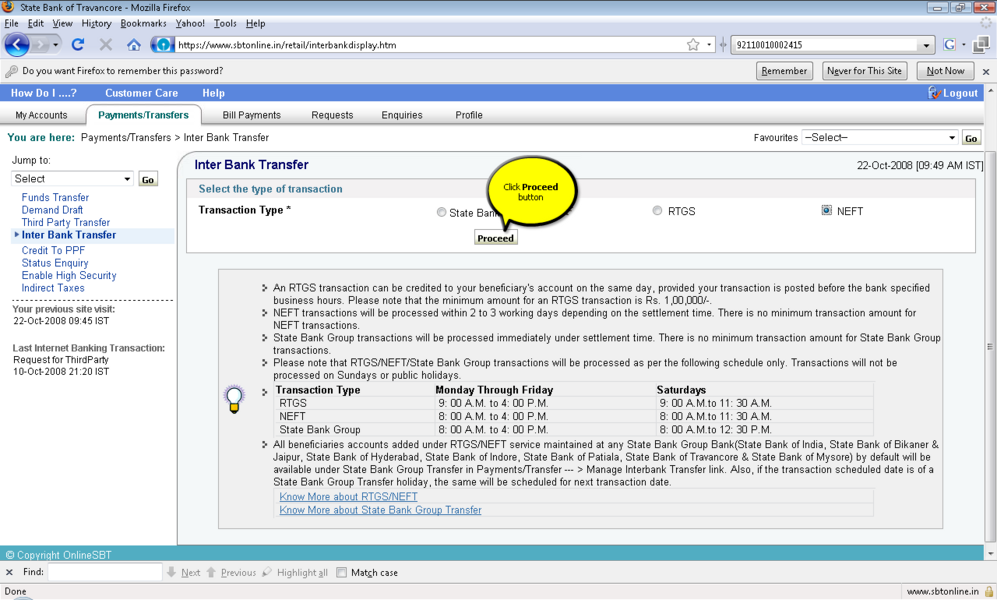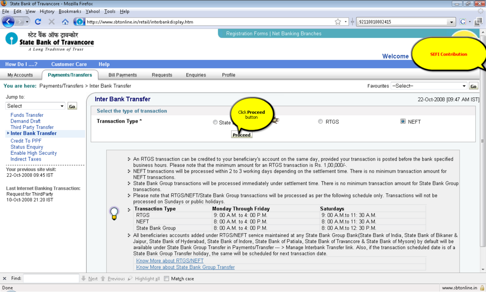 过程: 1。你应该积极的网上银行用户事务的权利。 2。登录到www.onlinesbi.com或web站点的印度国家银行以外的银行如果它使用您的印度国家银行网上银行ID和密码或任何国家银行集团银行在这个例子SBT使用。