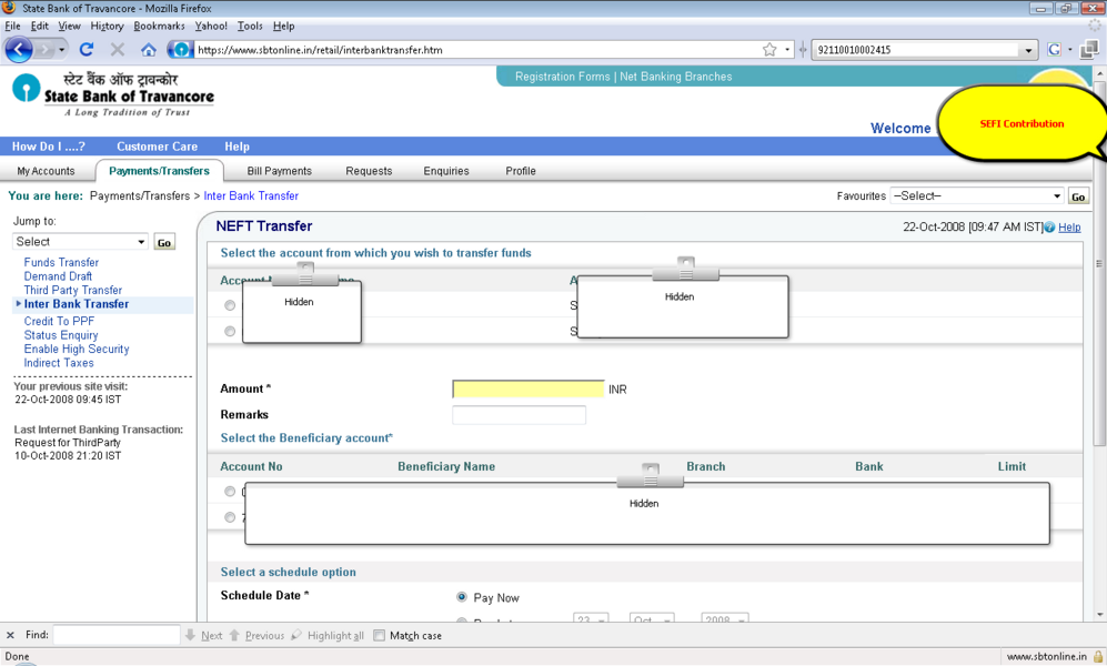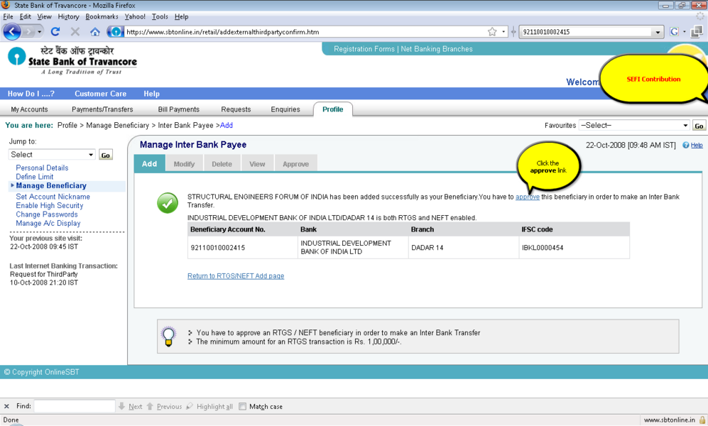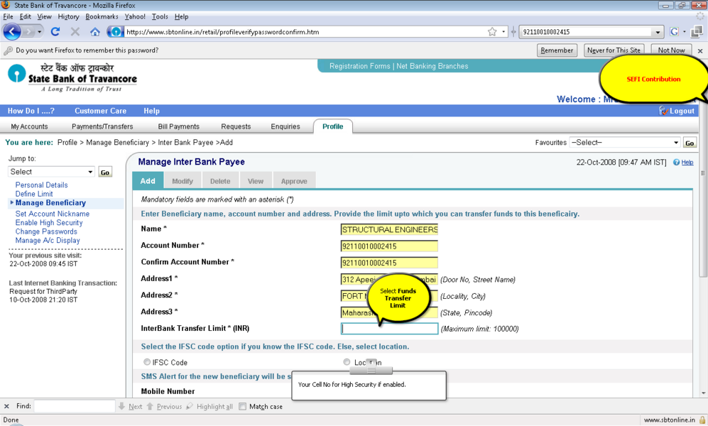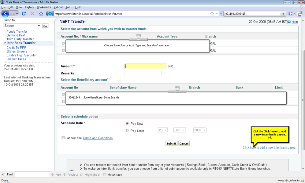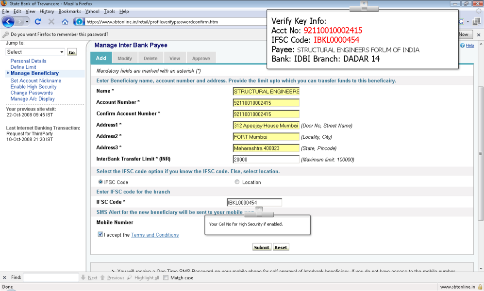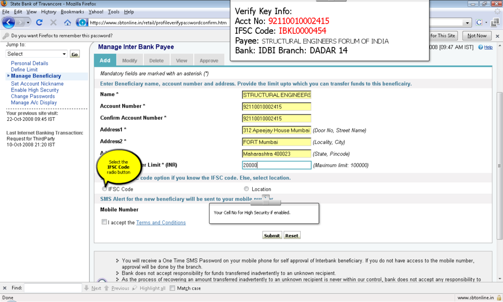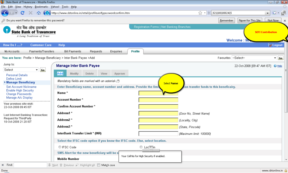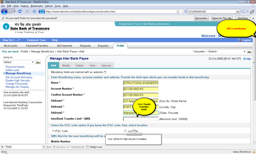 4所示。选择“添加”选项并提供受益人名称、受益人帐号,受益人银行 5。IFSC受益人银行的代码可以通过两种方式键入: 选项。单击IFSC代码,并显示一个文本框,您可以在其中输入11位IFSC的代码 b。点击位置的选择,以下是检索和显示。 6。受款银行名称下拉菜单 9。确认按钮后才会启用在条款和条件窗口中点击接受按钮。 11。添加受益人之后你将收到一个高度安全的密码在你的手机号码。这基本上是双重检查你的身份。提供密码授权受益人。受益人授权后你可以开始转移资金。 12。您可以继续支付通过单击“国际银行转账”链接在“支付/转账”选项卡。 13。选择NEFT,信贷账户信息将显示isr NEFT取决于分支 14。从列表中选择受益人注册的受益者。 15。你可以确认或取消交易。 屏幕截图来进一步解释 |