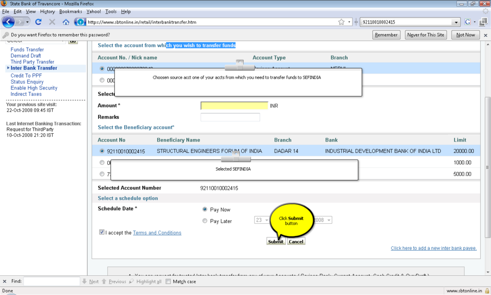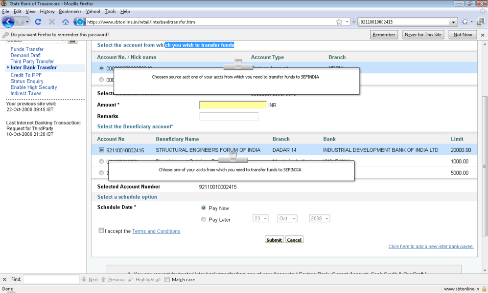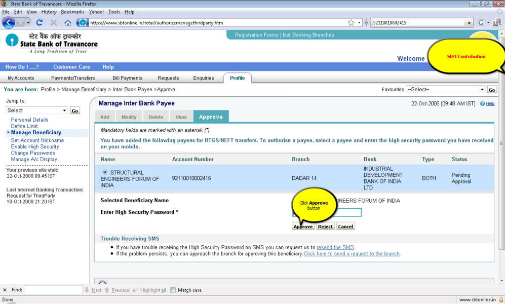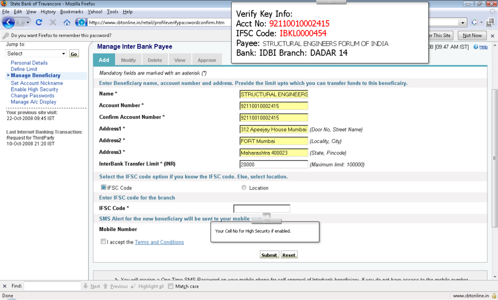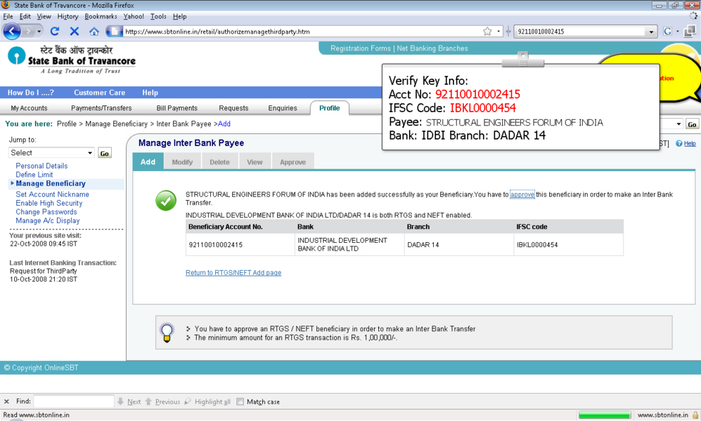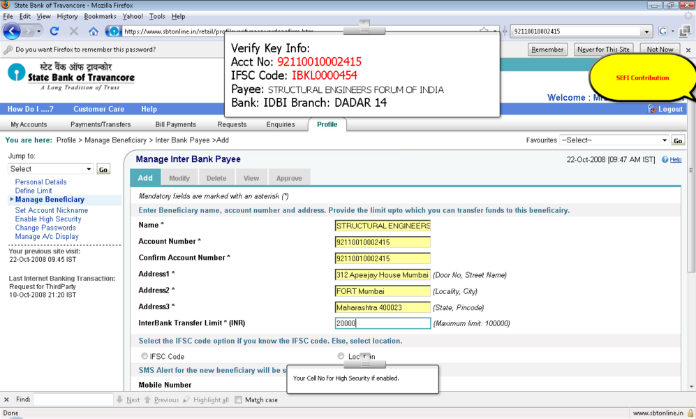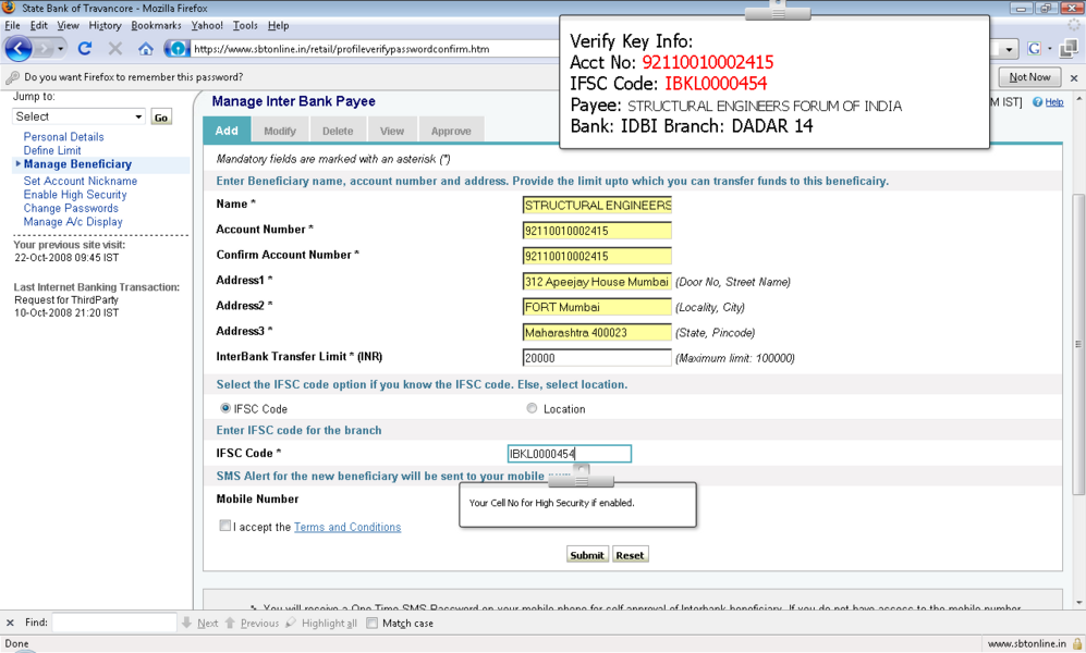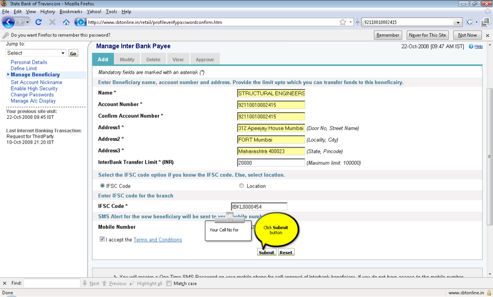 4所示。选择“添加”选项并提供受益人名称、受益人帐号,受益人银行 5。IFSC受益人银行的代码可以通过两种方式键入: 选项。单击IFSC代码,并显示一个文本框,您可以在其中输入11位IFSC的代码 b。点击位置的选择,以下是检索和显示。 6。受款银行名称下拉菜单 9。确认按钮后才会启用在条款和条件窗口中点击接受按钮。 11。添加受益人之后你将收到一个高度安全的密码在你的手机号码。这基本上是双重检查你的身份。提供密码授权受益人。受益人授权后你可以开始转移资金。 12。您可以继续支付通过单击“国际银行转账”链接在“支付/转账”选项卡。 13。选择NEFT,信贷账户信息将显示isr NEFT取决于分支 14。从列表中选择受益人注册的受益者。 15。你可以确认或取消交易。 屏幕截图来进一步解释 |