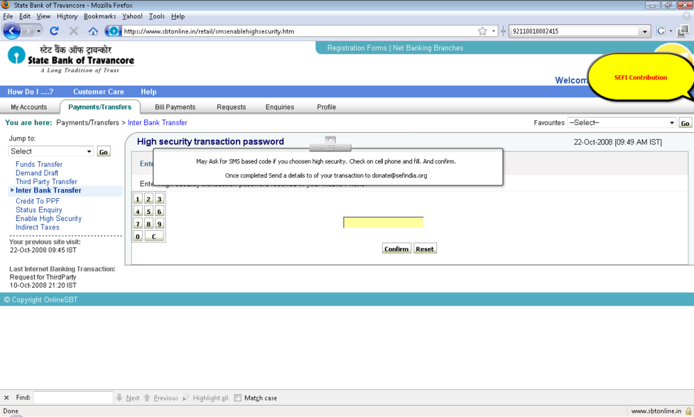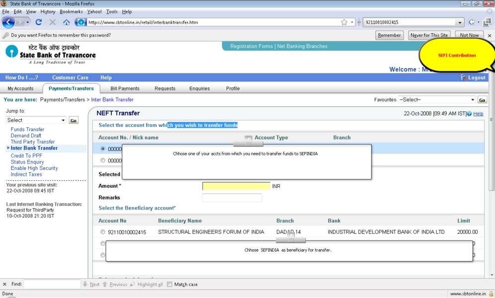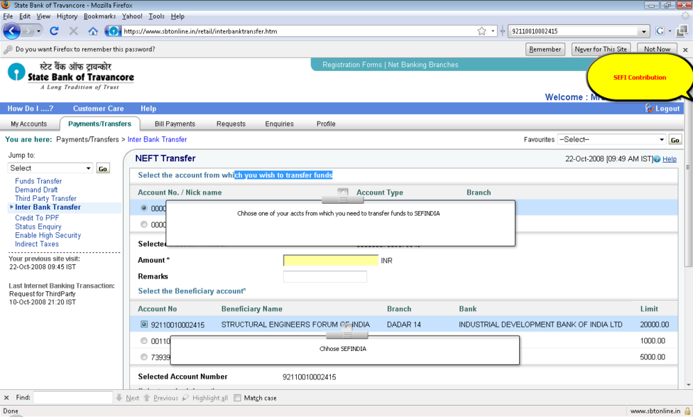 半岛软件下载SEFINDIA在线贡献示范(NEFT例子,国家银行集团)(使用HDFC银行账户而不是IDBI账户) (所有银行的信息是有效的步骤可能略有不同)。 关键信息: 半岛软件下载SEFI账户信息为新的世界经济论坛2010年4月1日 赞助可以发送通过划线支票/ DD 4 Jorawar餐馆93妇女Karve Rd 孟买400 020